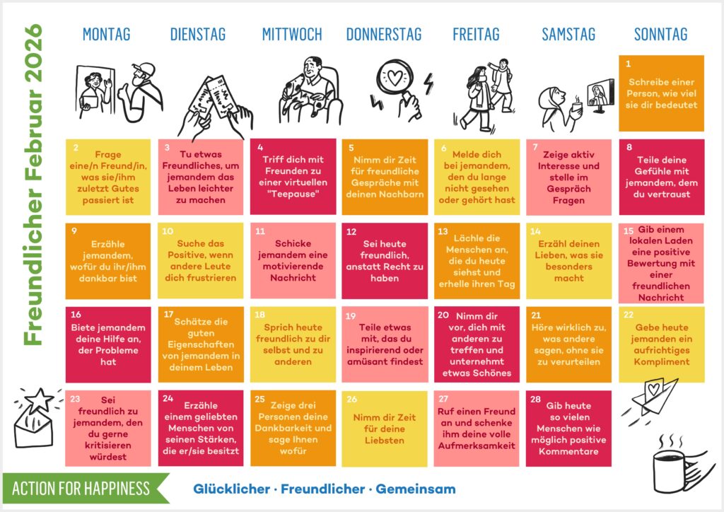 Lade dir für diese kleinen, täglichen Aktionen der Freundlichkeit gleich unseren Aktionskalender herunter und teile ihn mit deiner Familie und deinen Freunden: